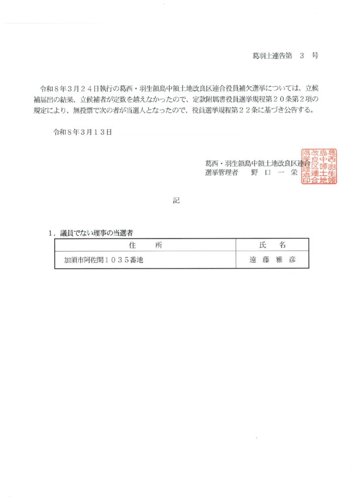 令和8年3月24日執行の葛西・羽生領島中領土地改良区連合役員補欠選挙については、立候補届出の結果、立候補者が定数を越えなかったので、定款附属書役員選挙規程第20条第2項の規定により、無投票で次の者が当選人になったので、役員選挙規程第22条の基づき公告します。